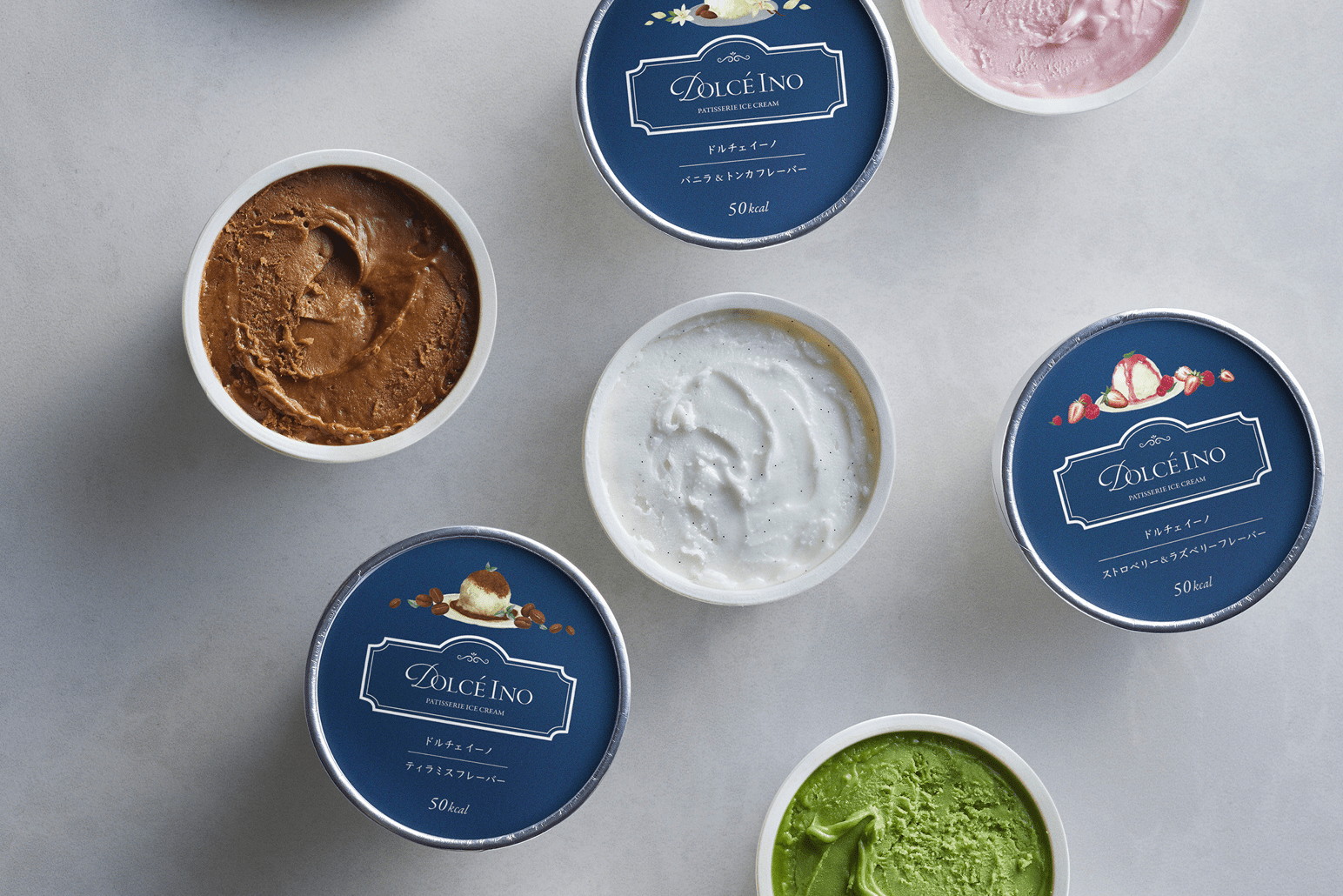 低カロリーアイス「Dolce Ino」は、人工甘味料を使わず、大豆と天然甘味料「羅漢果(ラカンカ)」を使うことで、驚異の50kcal、脂質1.2gを実現。アイス史上最少カロリーといえる商品で、誰でも罪悪感なくお召し上がりいただけます。ローカロリーにはこだわりつつも、味や食感も最大限こだわり、スプーンが通りやすく滑らかな舌触りが楽しめる至高のスイーツに仕上げました。全5種類の風味豊かなフレーバーで展開します。