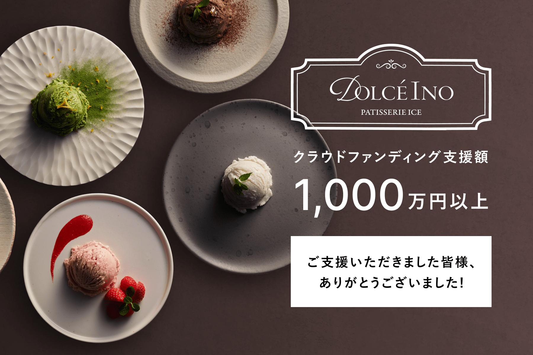 この度、クラウドファンディングを無事終了し、最終的に10,225,000円という多大なご支援をいただくことができました。改めまして、ご支援・ご声援をくださった皆さまに心より御礼申し上げます。いただいたご支援をもとに、「Dolce Ino」のさらなる品質向上と、より多くの方々にお届けできる体制を整えてまいります。今後の展開については、随時プロジェクトページやSNSを通じてご報告いたしますので、引き続きご注目いただけますと幸いです。本当にありがとうございました!